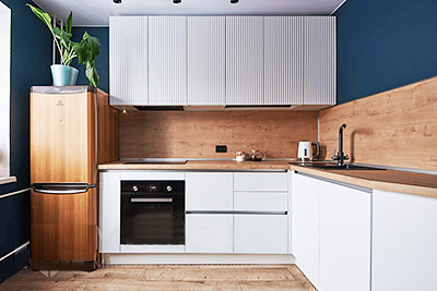 3. Г-образные кухни занимают промежуточную позицию между замкнутостью и открытостью. Они задействуют угол помещения и создают удобное рабочее пространство, сохраняя при этом ощущение свободы. Такая планировка особенно хороша для небольших квартир: она позволяет разместить максимум модулей и техники, не перегружая пространство. Одна линия берёт на себя основную работу — варку и мойку, а вторая служит дополнительной поверхностью для подготовки или хранения. Если грамотно использовать угловые модули — карусели, «магические углы» или выкатные системы — ценного пространства практически не теряется, а кухня становится заметно удобнее и функциональнее.